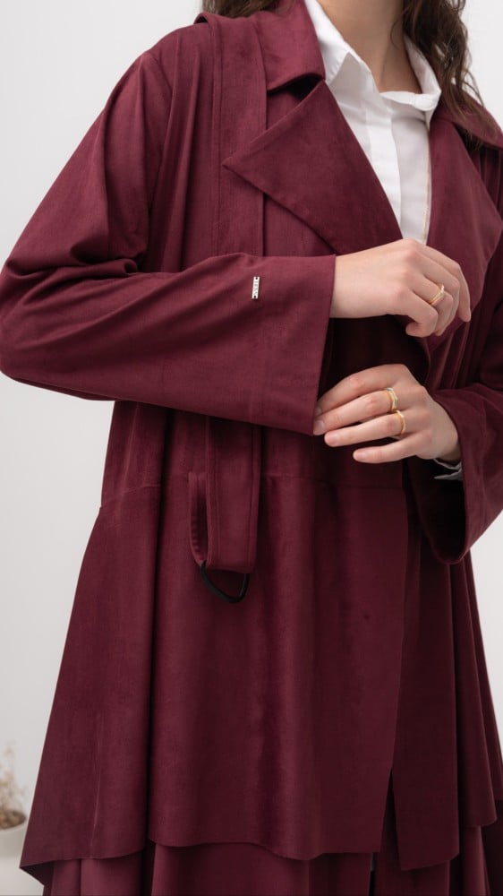 لعاشقات اللون الخمري المحمر الراقي صممنا هذه العباية بقصة المعطف الطويل بقماش الفلفت الشامواه الدافيء و اكسسوار أسود مميز