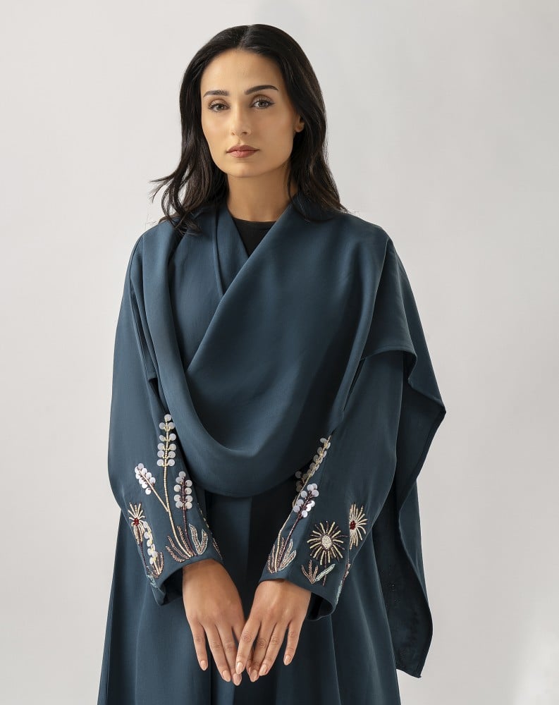 عبايه من الكريب الياباني و الشك اليدوي بالاكمام و الخلف بموديل شال