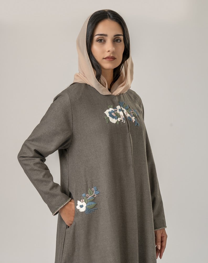 عبايه من الجوخ الرمادي مبطنه و مطرزه بتطرييز يدوي تتوفر بعدة الوان