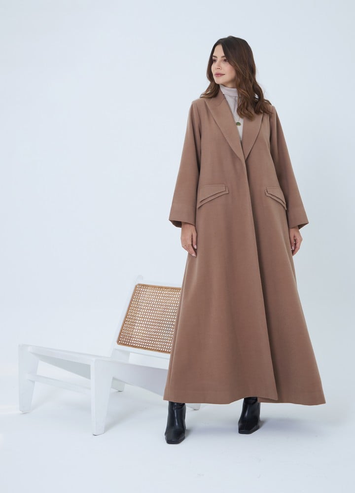 Enjoy an elegant and modern look with this dark beige abaya made of luxurious European wool fabric. This abaya is characterized by its high quality and unique design, making it an ideal choice for various occasions, whether daily or special.