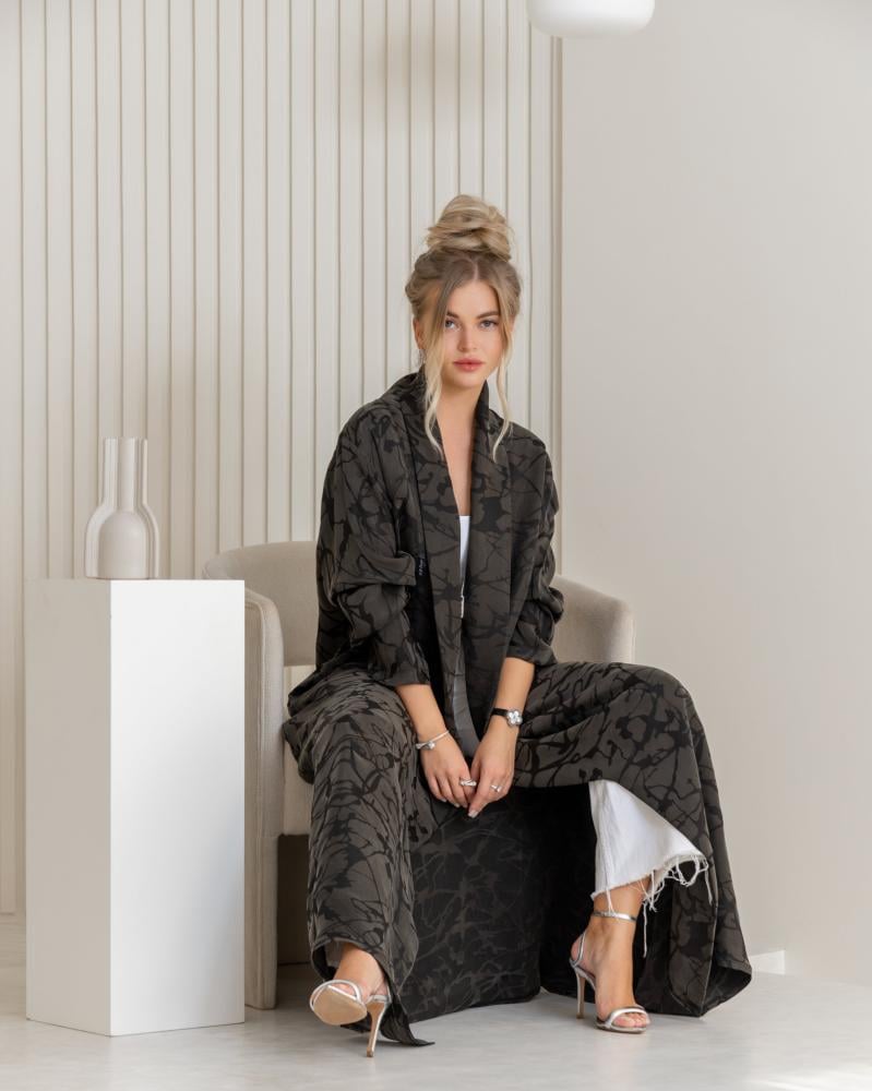This Olive Abaya comes with a design that reflects calmness and luxury, made from soft printed fabric in dark olive color, making it an ideal choice f...