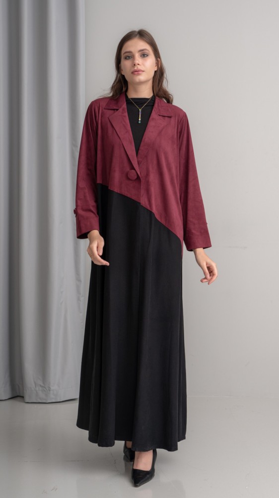 An elegant, classic black abaya for all occasions, made of wonderful twill fabric with a warm, elegant burgundy red suede addition, which increases the elegance, brilliance and luxury of the abaya, with a high-quality black sheila.