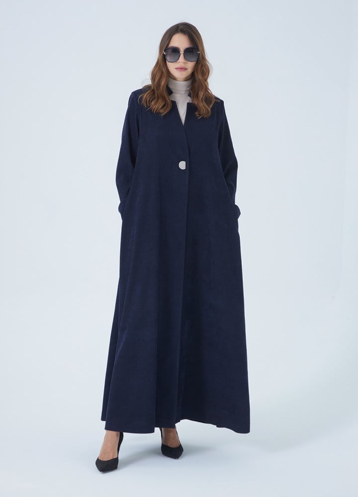 Abaya made of luxurious striped suede fabric, with an elegant jacket cut and one button, from this season’s fall-winter collection.