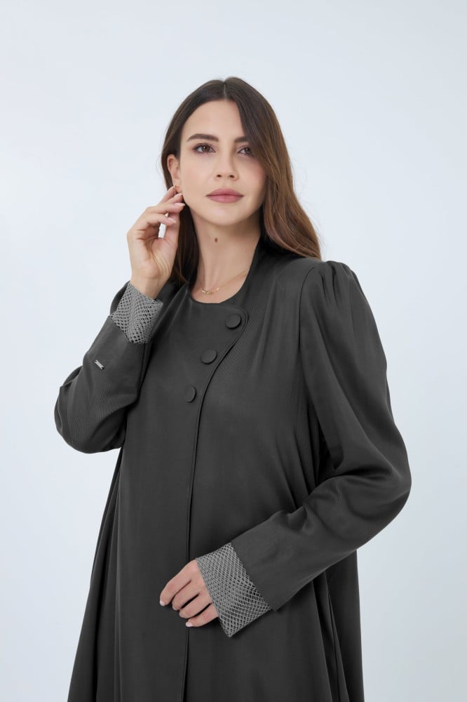 Abaya made of luxurious and wonderful twill fabric in a royal color. We added a touch of light, soft and elegant Italian mesh fabric on the sleeves.