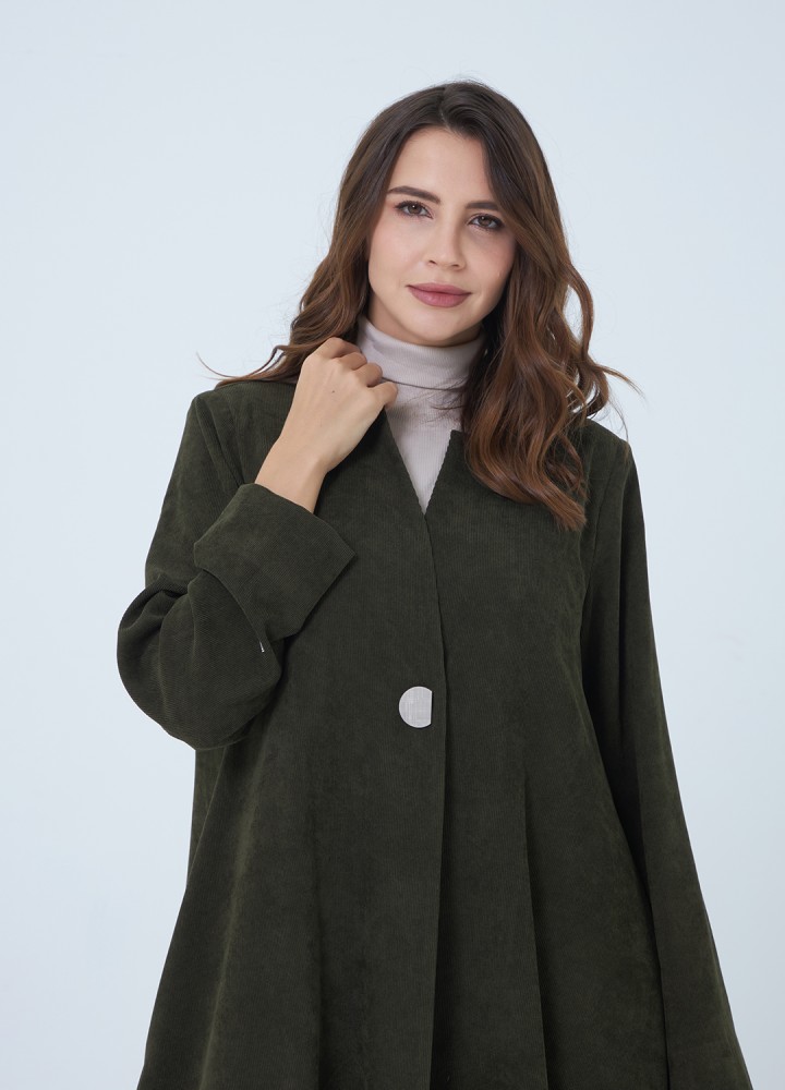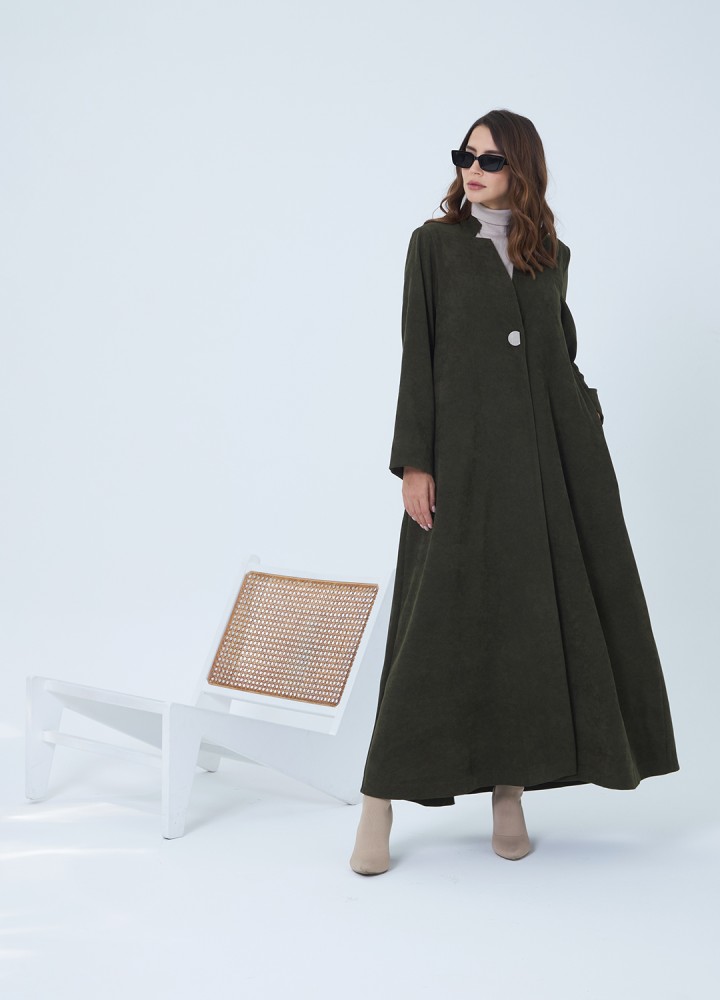 Abaya made of luxurious striped suede fabric, with an elegant jacket cut and one button, from this season’s fall-winter collection.