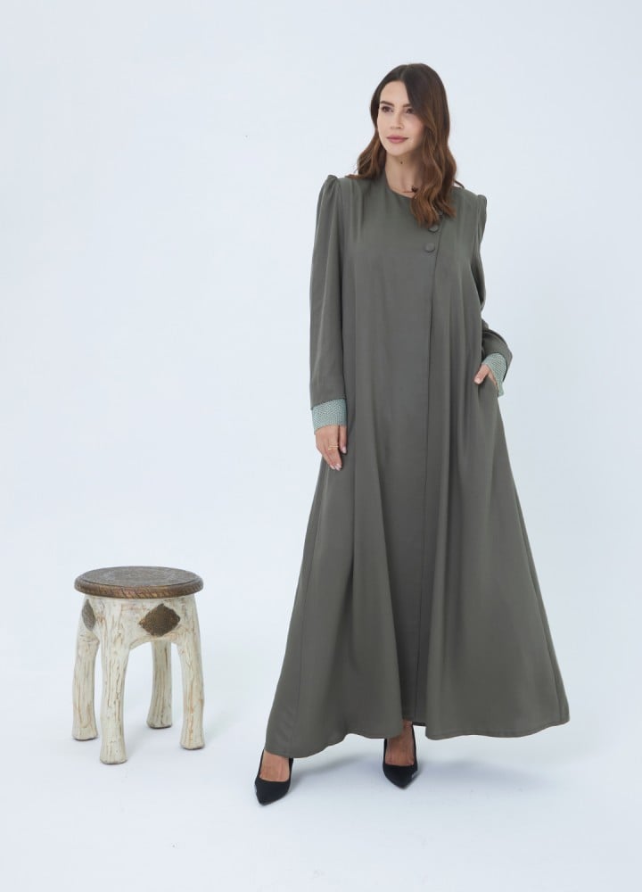 Abaya made of luxurious and wonderful twill fabric in a royal color. We added a touch of light, soft and elegant Italian mesh fabric on the sleeves.