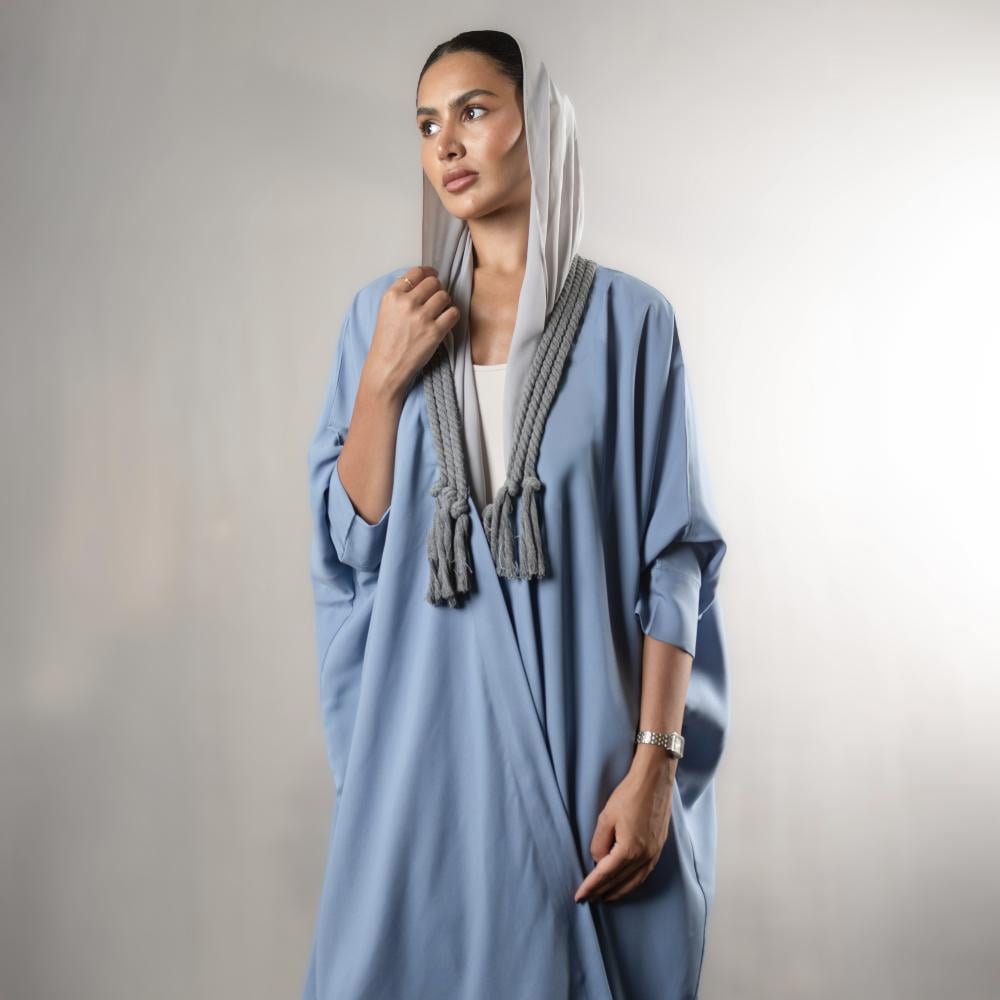 - Matching Scarf : The silk abaya comes with a matching scarf in dark sky blue, to reflect harmony and elegance in your look.