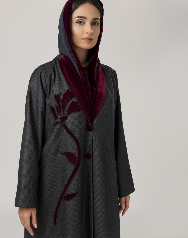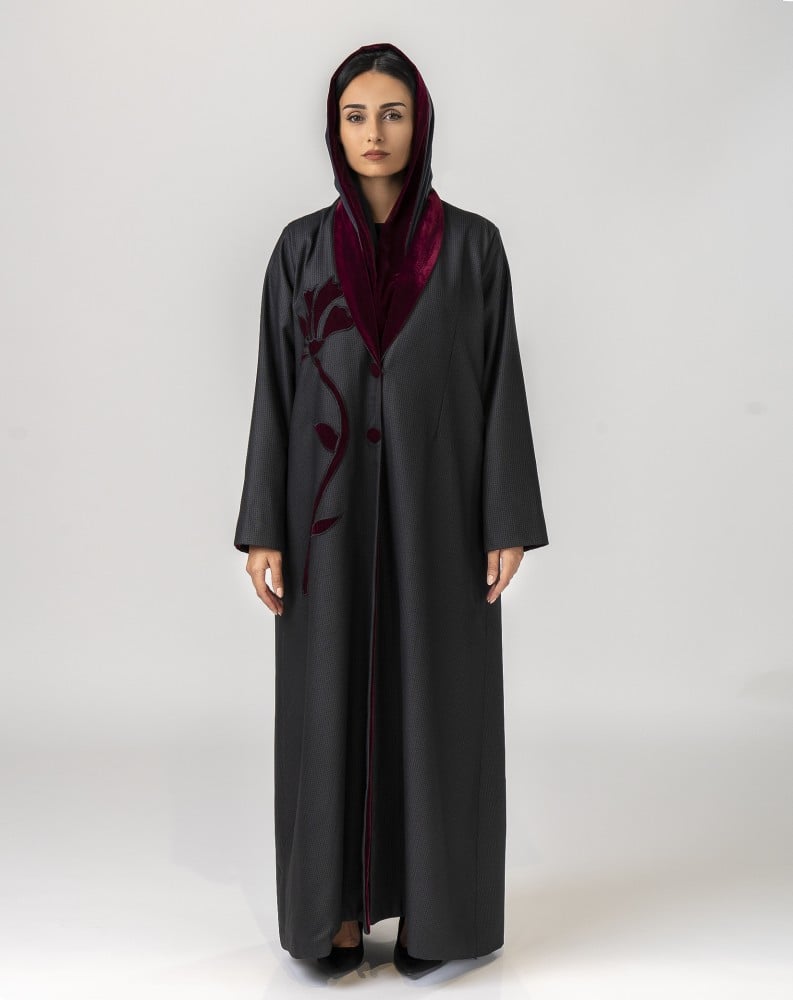 Linen and velvet abaya lined in dark gray with burgundy velvet