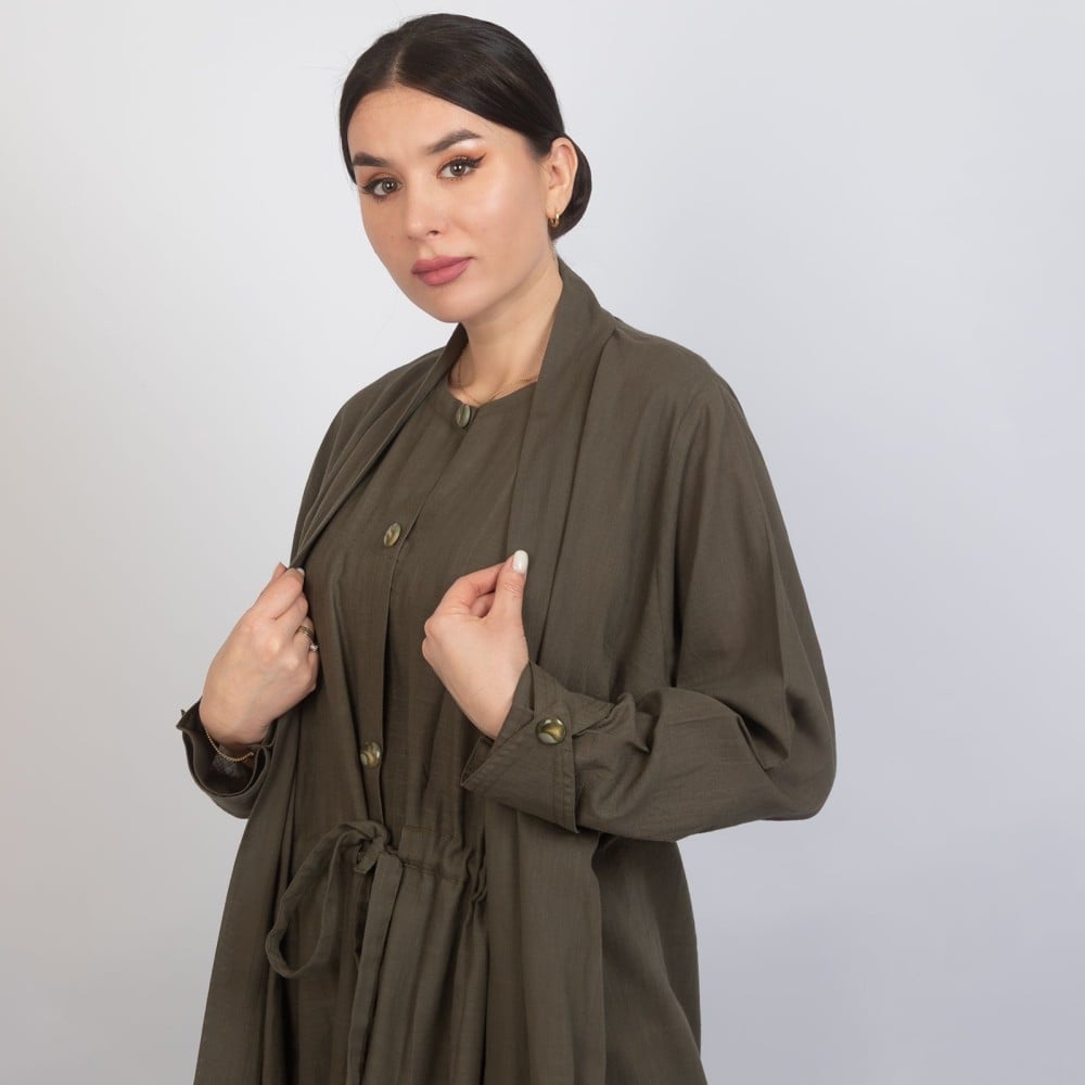 Linen abaya in olive color in the form of an inner dress with a veil of the same color