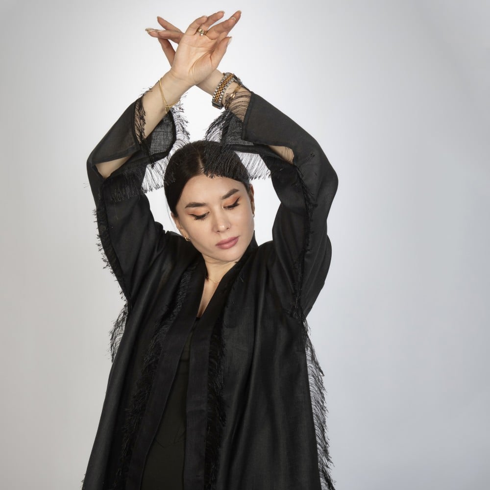 Linen abaya, black, cut with a veil that matches the color of the abaya