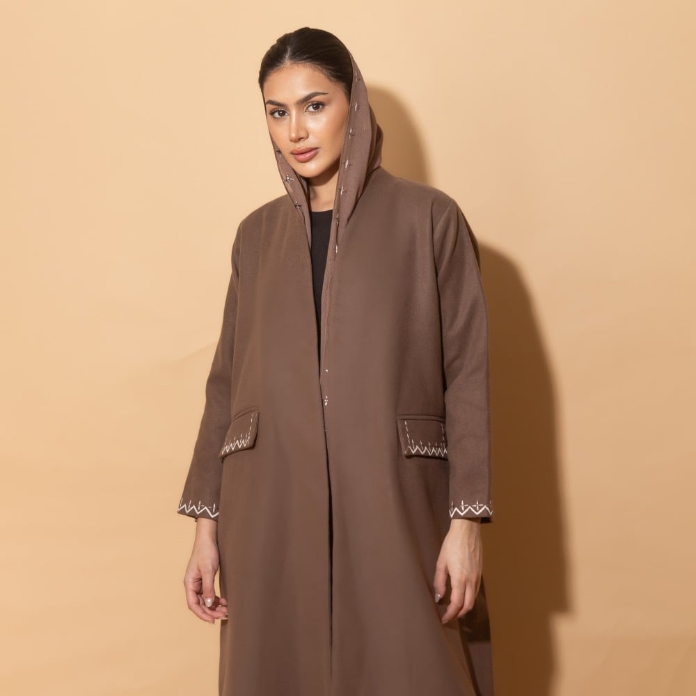 Winter broadcloth abaya, half-cloth cut, brown color