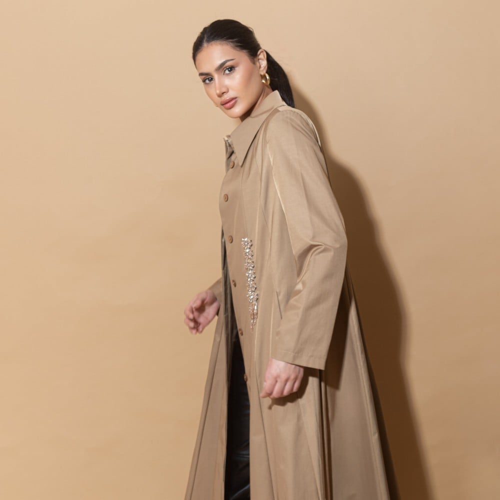 Blazer abaya in taffeta fabric with cotton, front buttons and hem, camel beige color